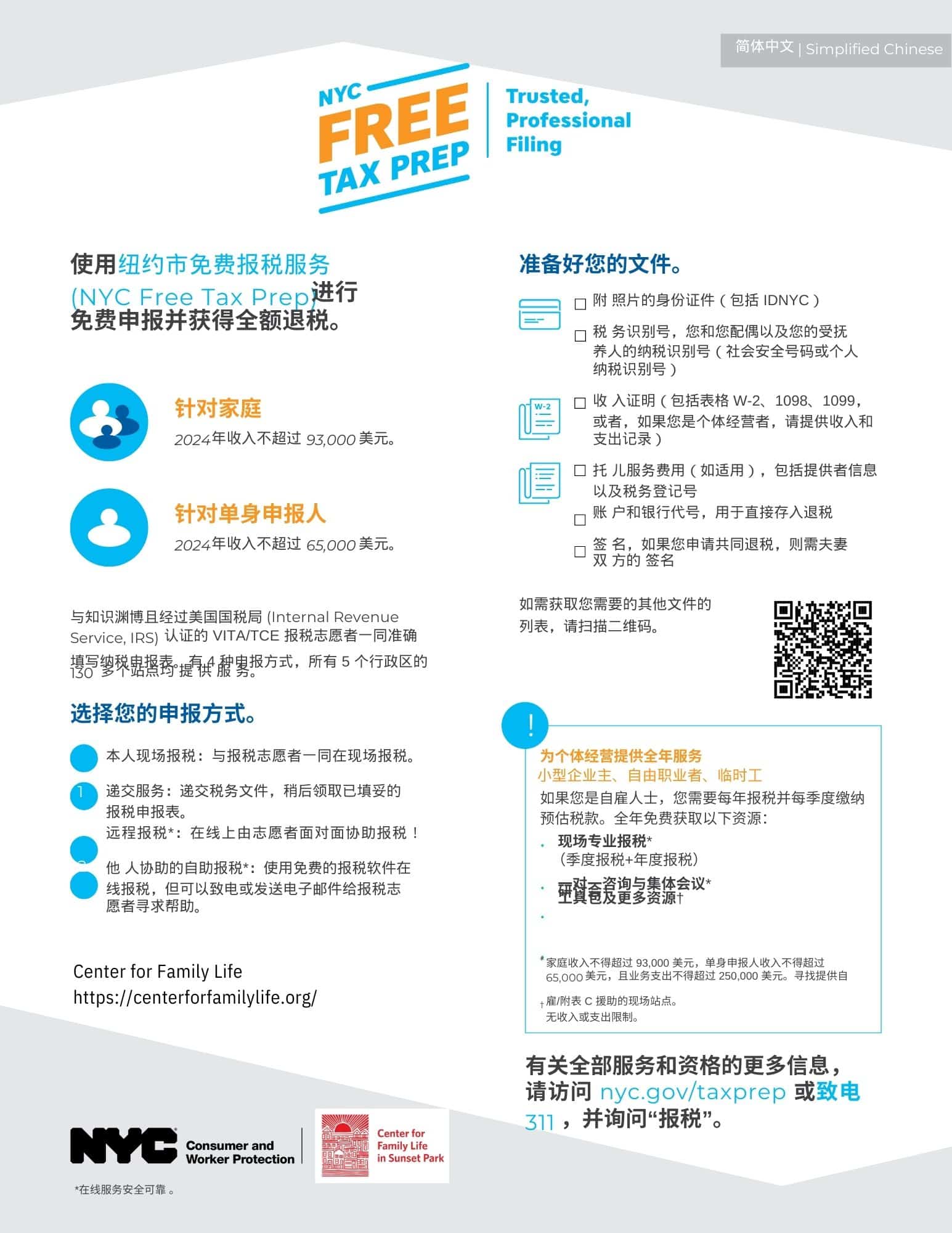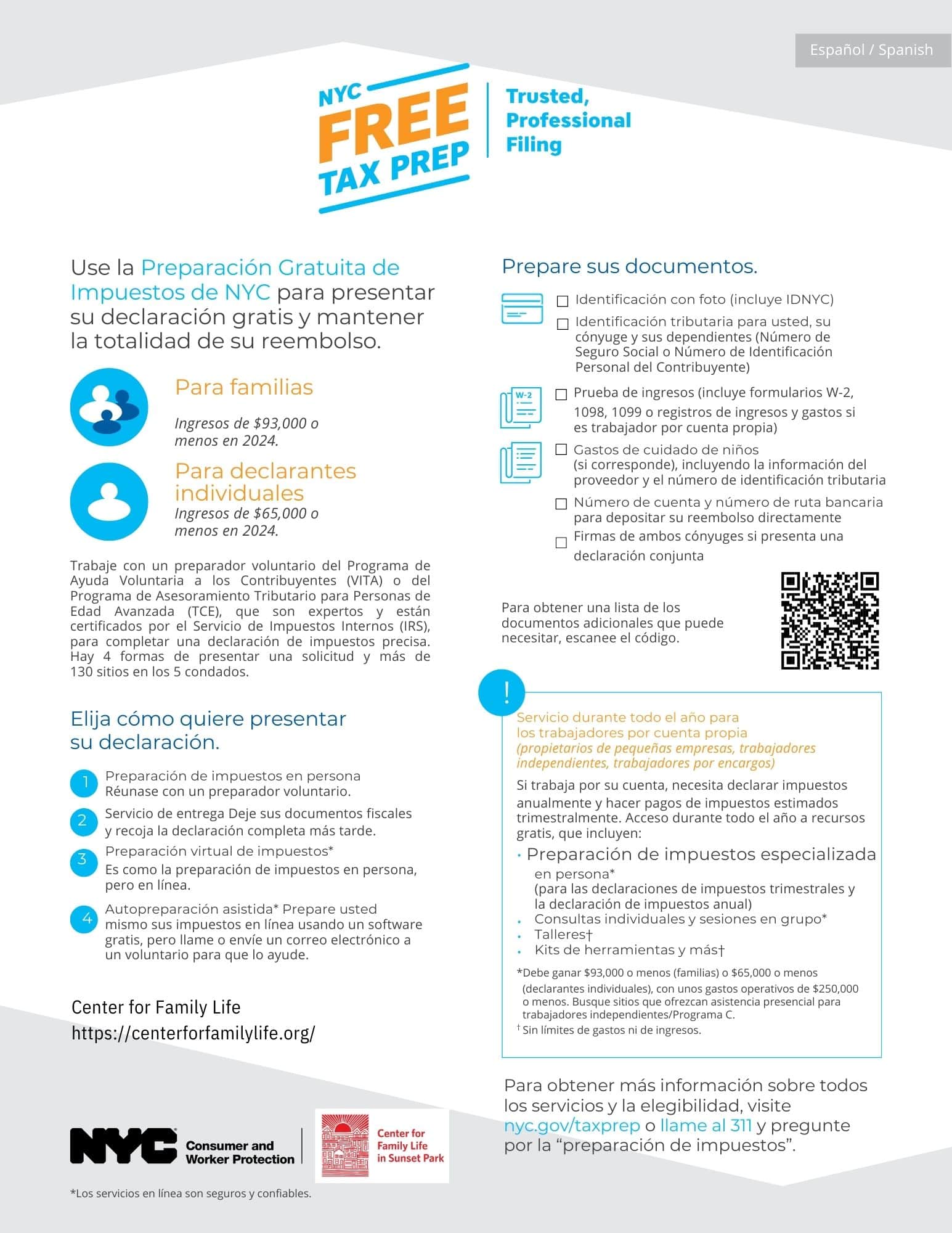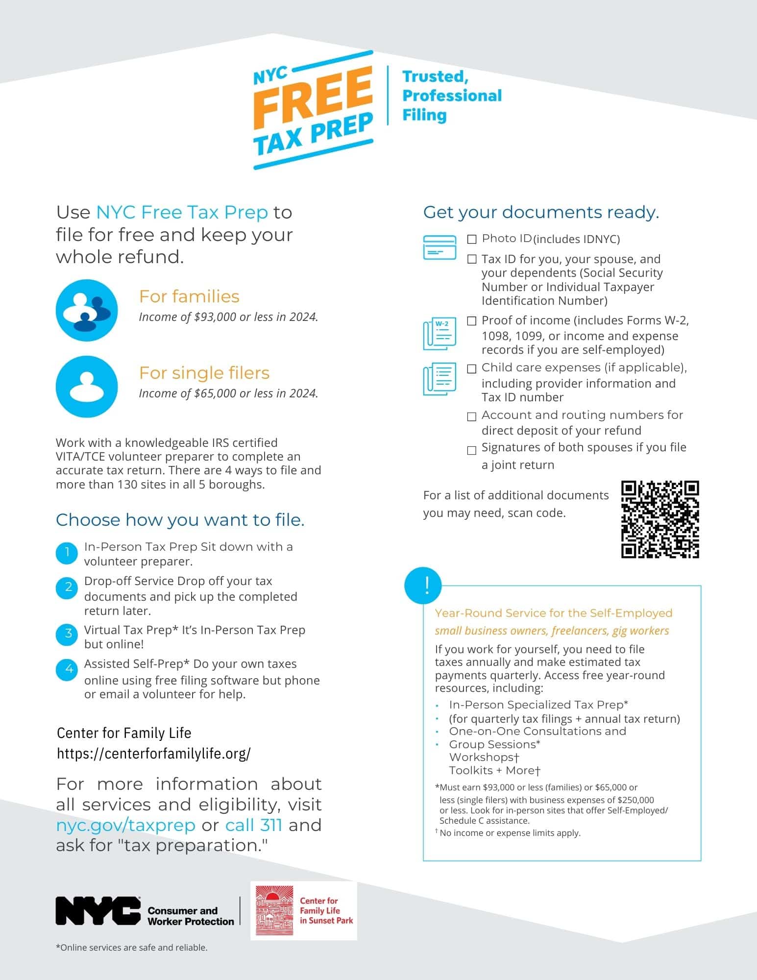FREE tax-filing services are available beginning January 27th, 2025 at the Center for Family Life’s main location, and at NYU Langone starting on January 28th. In-person services are available at both locations until April 15th, 2025, and are by appointment only.